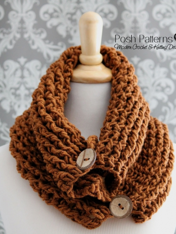 This elegant crochet button cowl is very stylish and easy to wear. Perfect for fall fashion, and for gift giving. It is worked with a bulky yarn and a large hook, so you can crochet today and wear it tonight!